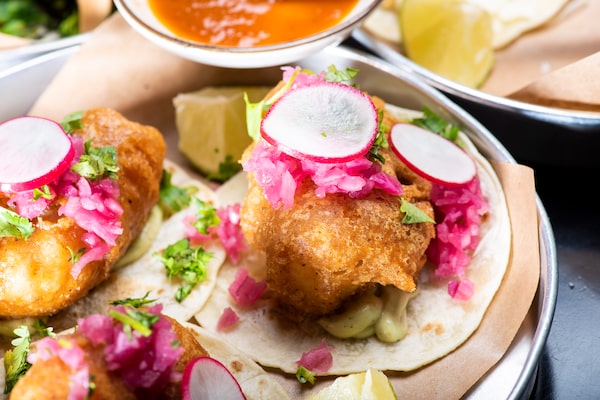 The crispy cod tacos come with a brightly spiced avocado crema.Jimmy Jeong/The Globe and Mail