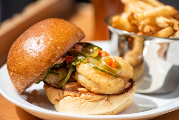 Buttermilk-fried prawn on white bun with pickled peppers and smoked-sockeye mayo.Jimmy Jeong/The Globe and Mail