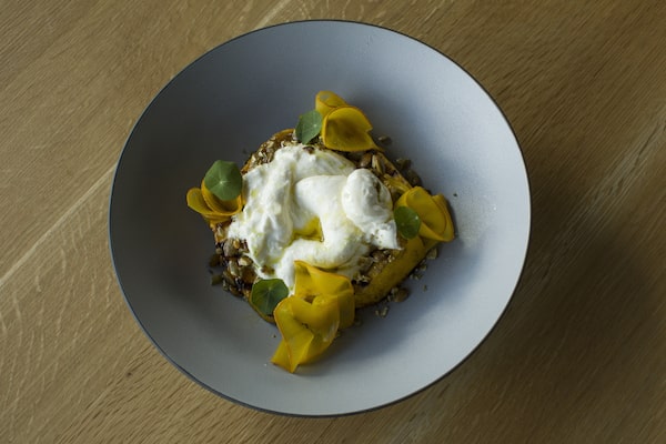 They highlight fabulous local ingredients, including a gently weeping round of burrata from Tanto Latte in Salmon Arm, which was framed by layers of sugar pumpkin – charred wedges, roasted seeds and more wide petals (thinly shaved on a meat slicer and hot pickled with warm spices).