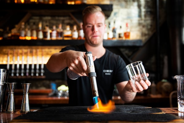 Bartender Chris Lade makes a double smoked Old Fashioned cocktail at Comery Block in Calgary.Todd Korol