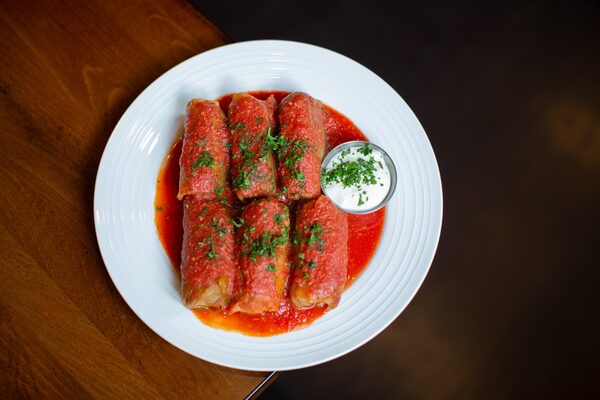 The menu mostly comprises classic Ukrainian staples. There are a few nods to local tastes, including vegan cabbage rolls filled with mushrooms and kidney beans, which are small, tightly rolled and smothered in a nicely balanced tomato sauce. And some more generic fine-dining flourishes at dinner, such as confit duck on a bed of braised cabbage and lamb shanks deglazed with Jagermeister.