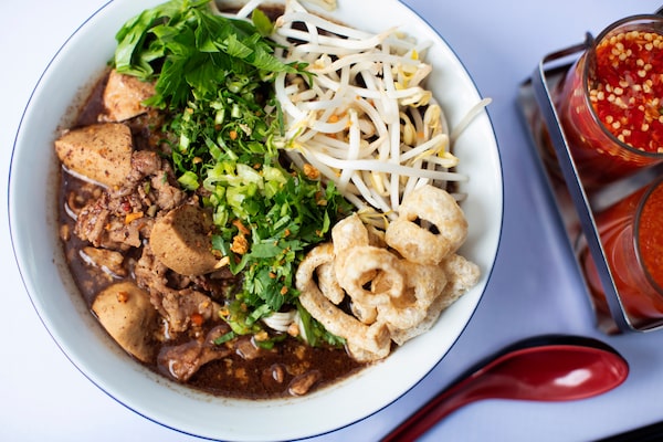 Boat noodle soup made with pork blood, pork meat, pork balls, coriander, green onions, bean sprouts, Asian celery and pork rinds.Rafal Gerszak/The Globe and Mail