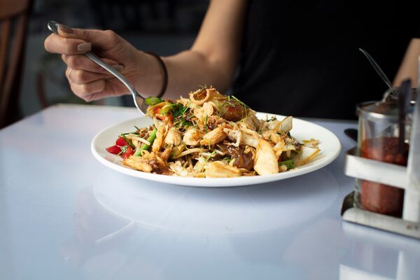 It doesn’t look particularly appetizing. But the warm wok breath combined with the floral vibrancy of fresh mint and holy basil is intoxicating. The textural contrast of silky noodles and bouncy pork against the crisp crunch of gai lan, bell peppers and bean sprouts is captivating. And the taste – dark and caramelized, brightened with herbaceous lime and buzzing with tingly heat – is divine.