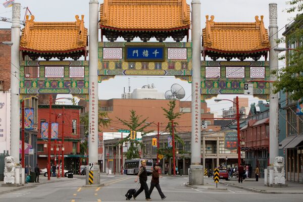 A couple cross the street outside the gates to Chinatown in downtown Vancouver, B.C.Jonathan Hayward
