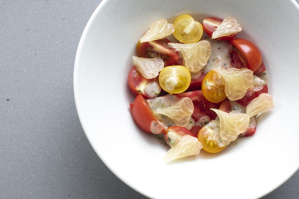 Lettuces with spot prawns brain and sablefish, tomatoes prepared with roast beef fat and walnuts, and Cloudy Turnip Soup.Rafal Gerszak/Rafal Gerszak