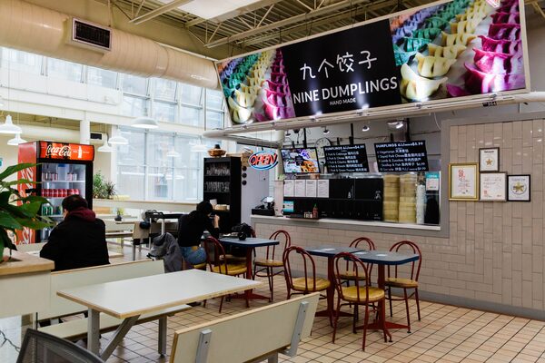 The upstairs food hall was once home to 13 stalls. Now there are three: Hida Takayama Ramen (which specializes in a rare sesame broth, but is currently closed for renovations and under new management); Nam San Korean Cuisine (the signature blood sausage in spicy broth is popular among language students who use the tables on the food court’s empty side for speed-dating-style conversational classes); and Nine Dumplings, also known as Nine Dishes.