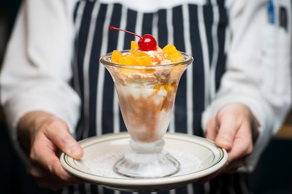 A soft-serve ice-cream sundae featuring flavours of blood orange and vanilla with citrus caramel and salted shortbread at Coquille.BEN NELMS/The Globe and Mail