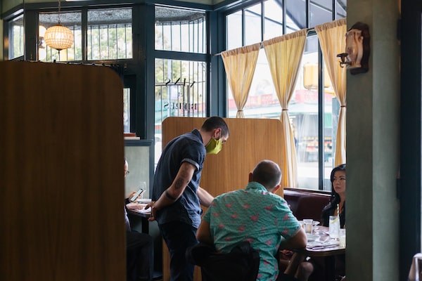 The St. Lawrence restaurant in Vancouver, seen here on July 1, 2020, has embraced an intimate dining experience with wooden dividers instead of plexiglass.Jackie Dives/The Globe and Mail