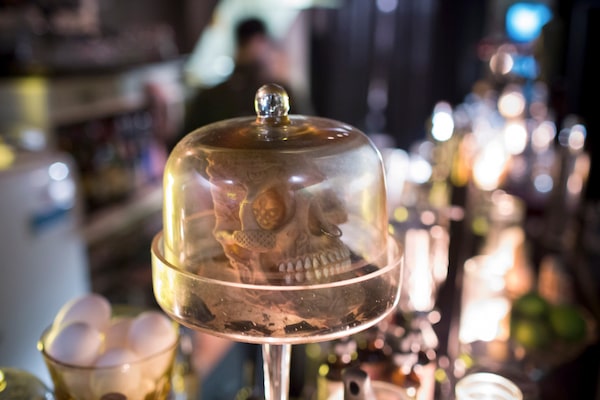 Inside, an L-shaped bar roughly lacquered in black is cluttered with flickering prayer candles, skull paraphernalia and a cut-crystal candy jar filled with Skittles.BEN NELMS/The Globe & Mail