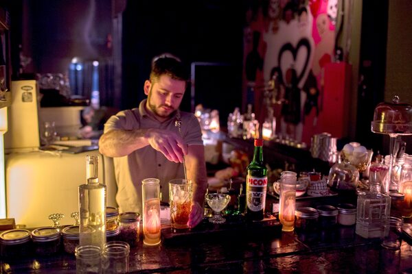 “Do you know about our cellphone policy?” the bartender asks politely, nodding to a sign scrawled across a thrift-store mirror.
