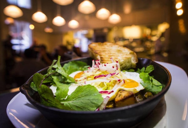 The Fricassée Champignon dish at Cafe Medina which is made up of two fried eggs, sherry roasted mushrooms, roasted potatoes, caramelized onions, summer greens, applewood smoked cheddar with grilled focaccia seen here October 15, 2014.John Lehmann/The Globe and Mail
