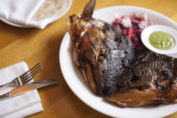 I approach the beautiful-ugly appetizer tentatively, carving thick flakes of fatty collar from the neck ruff and wrapping them with tangy pickles and creamy aioli into warm, delicate, crispy-edged flour tortillas. Before long, baser primal instincts kick in. I dive down with my fingers, tearing apart the cheeks to find the juicy prized meat within. I slurp slippery bits off the bones, spit out a hard white marble that looks like an eye (but must be a jaw-bone joint ball) and resurface with smoky, deeply herbed chili sauce smeared all over my chin.