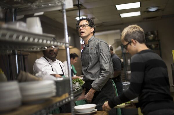 Chef Jamie Kennedy, centre, works in the kitchen during the lunch rush at Gilead Wine Bar in Toronto on Friday, November 21, 2014.Darren Calabrese