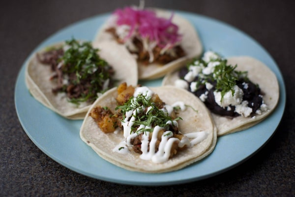 Four different tacos including marinated pork, organic braised beef, slow cooked beans and house made chorizo at Molli Cafe in Vancouver, British Columbia, Wednesday, June 24, 2015.Rafal Gerszak/The Globe and Mail