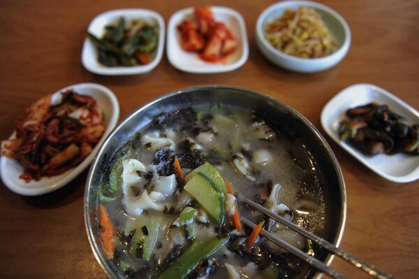 Sujebi, a Korean noodle soup, at Mot Na Son. Small dishes of banchan accompany the soup.Fred Lum/The Globe and Mail