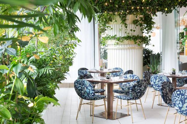 At the top of the central staircase, we find ourselves in the narrow cocktail bar and "laboratory," one of four distinct zones (including the main dining room, lush solarium and terrace and Champagne lounge), which attempt to layer the sprawling 5,000-square-foot space into an integrated ecosystem.