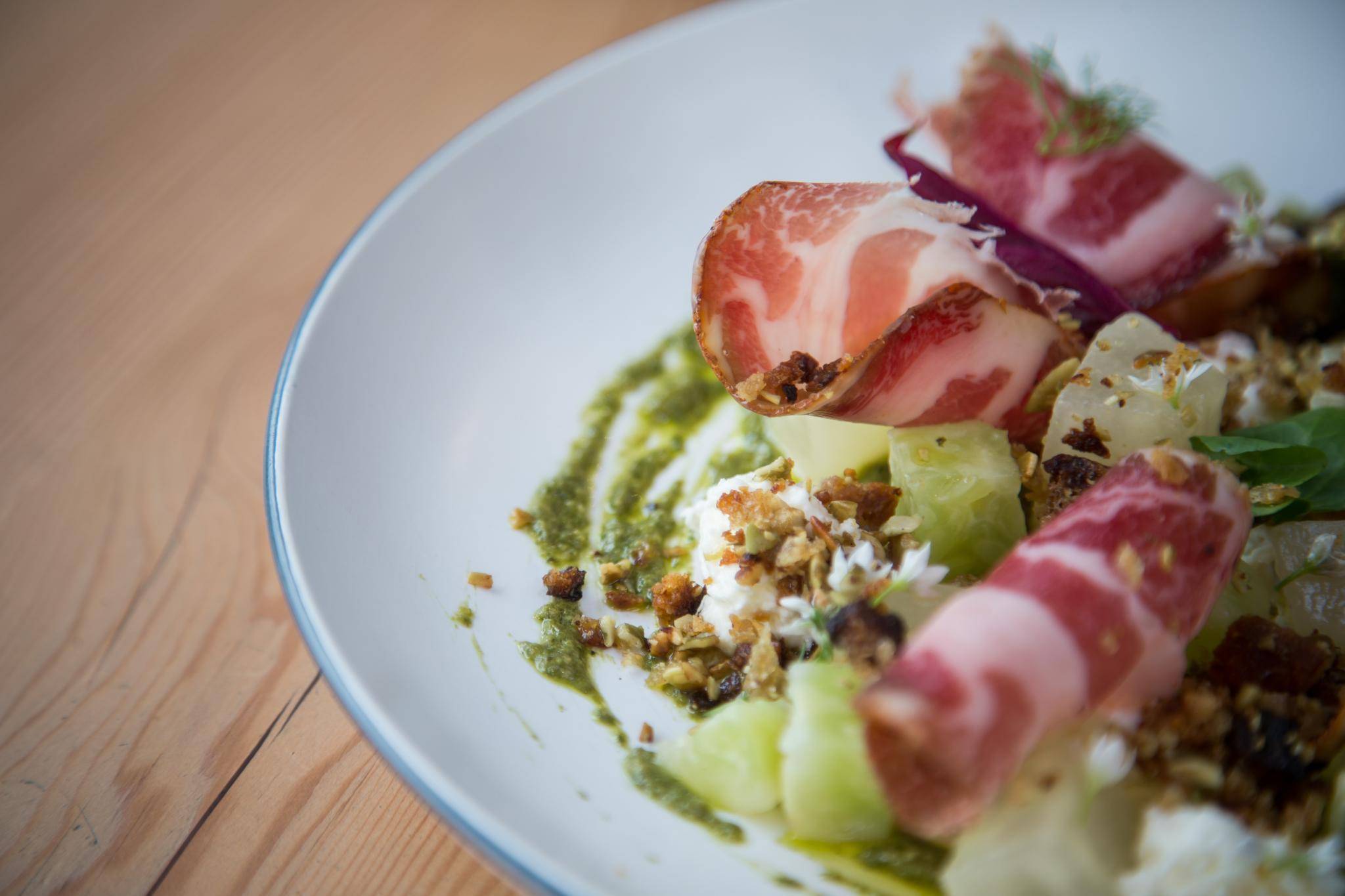 A compressed cucumber and melon salad is juicy and fresh, garnished with lusciously marbled coppa, creamy fior di latte and crunchy pumpkin-seed pesto. The pork and melon combination might remind you of prosciutto e melone, an old Italian-wedding staple, reinvented and lifted for modern tastes.
