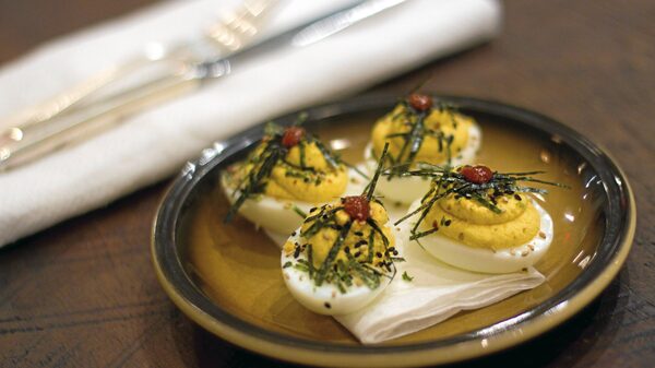 Devilled eggs are jazzed up with Sriracha sauce and go beautifully with the lobster roll at Yours Truly