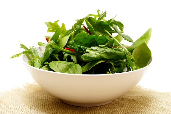 You should eat at least one serving (equivalent to one-half cup cooked or one cup raw) of leafy green vegetables, such as this spinach and kale salad, every day.dlerick/iStockPhoto / Getty Images