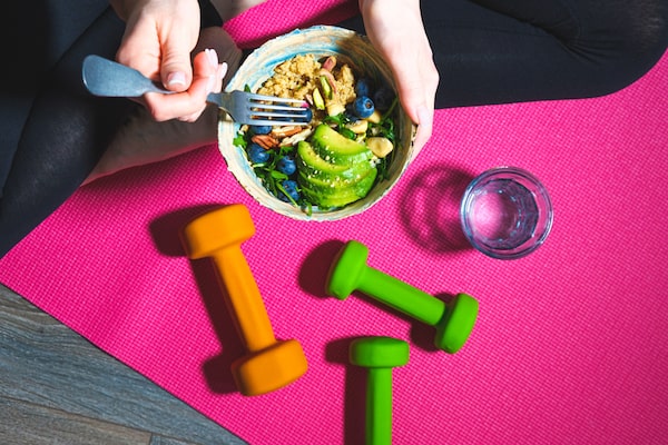 Woman on fitness mat eating healthy vegan salad after workout. Vegan diet and sport concept.vaaseenaa/Getty Images