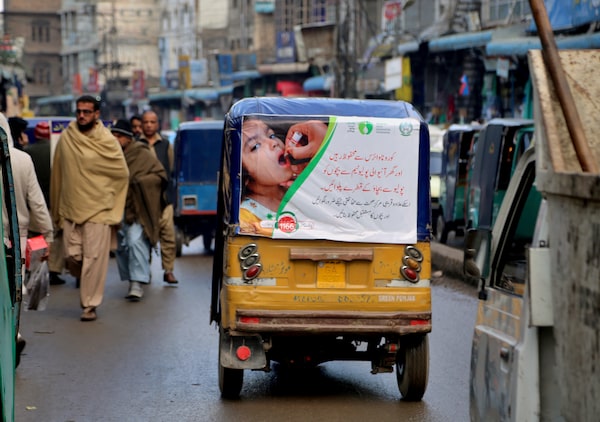 An auto rickshaw with a poster advertising an oral polio campaign drives through a market in Peshawar, Pakistan, in this 2020 file photo.Muhammad Sajjad/The Associated Press