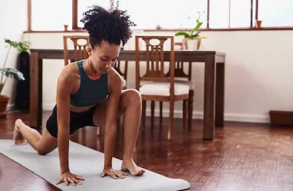 Shot of a young woman practicing yoga at home Your body deserves the gift of good health Lunge stretch dynamic yogaHiraman/Getty Images