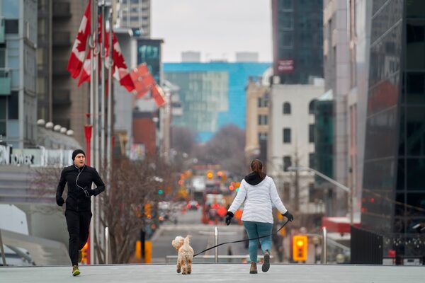 A jogger keeps his distance from a woman walking her dog in downtown Toronto on March 24, 2020.GEOFF ROBINS/AFP/Getty Images