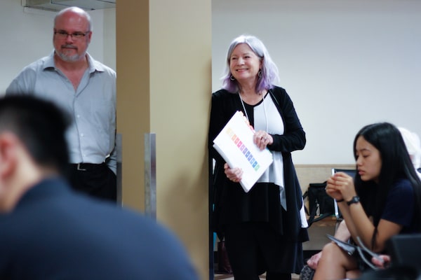 Debra Sheets (centre), University of Victoria nursing professor and affiliate of UVic's Institute on Aging and Lifelong Health, is the lead researcher of the Voices in Motion intergeneration choir and research study along with UVic sociologist Andre Smith (left) and others.Suzanne Ahearne/UVic