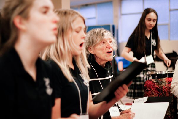 Gracia Seal (centre) and St. Andrew's Regional High School students Jessica Coady(left), Claire O'Neill and Mari Chambers on percussion, practice with the Voices in Motion intergenerational choir project led by University of Victoria researchers.Suzanne Ahearne/UVic