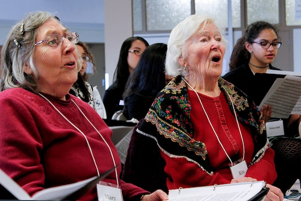 Gracia Seal (centre) and her daughter Lorelle Sihota (left) are participants in the Voices in Motion intergenerational choir and research project led by University of Victoria researchers.Suzanne Ahearne/UVic