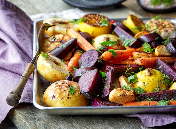 Roasted fruits and vegetables on a wooden table.Magone/iStockPhoto / Getty Images
