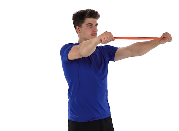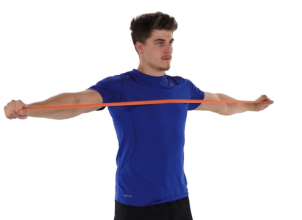 Grab the ends of a resistance band with your hands slightly wider than your shoulders, and arms parallel to the floor. Your arms should have a bit of a break in the elbows, but not much. Now squeeze your shoulder blades together while pulling your hands apart until the band touches your chest. Hold the squeeze for a second, then bring your hands back together, keeping control. Focus on the muscles in the upper back and shoulders, not your arms.