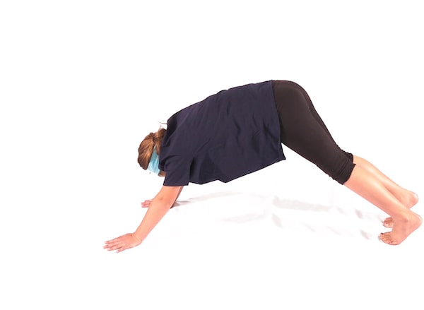 This is a productive exercise that combines three movements into one: a high plank, a downward dog and a push-up. Start in a downward dog. From here, shift your weight forward while lowering your hips, bringing your shoulder overtop your hands. You should now be in the top position of a push-up. Complete the movement by bending your elbows and bringing your chest towards the floor while keeping your core engaged and back in a straight line. Now imagine pushing the floor away as you bring your hips back into the air, returning to the downward dog. Use your knees during the push-up portion if necessary.