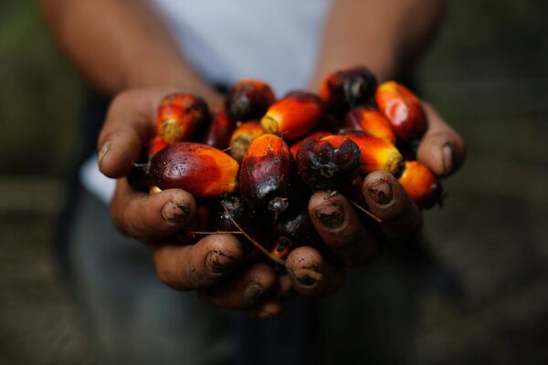 A worker shows palm oil fruits at a plantation in Chisec, Guatemala Dec.19, 2018.Stringer ./Reuters