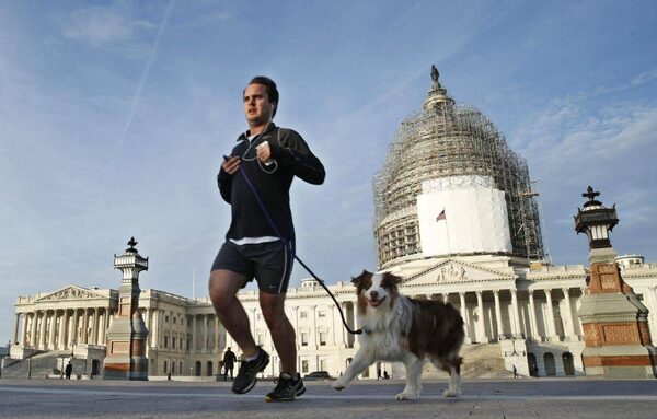 A man jogs with his dog past the U.S. Capitol in WashingtonKEVIN LAMARQUE/Reuters
