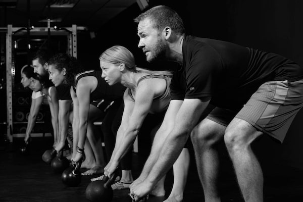 Any class with sustained bell work will probably include the swing, a staple of kettlebell training. In the swing, you use your legs, bum and core to swing the bell from between your legs to shoulder height. At Bang, we did swings, and then more swings, and then a few more. The initial main set was three rounds of two minutes of swings, one minute of single-arm swings on each arm, one minute of overhead presses and one minute of squat jumps. Between the second and third set of swings, Emily turned to me and said, "It is lucky I like you so much." I think she actually liked the challenge – she is an athlete at heart – but shooting dirty looks is often part of the fun when working out. Other kettlebell staples are goblet squats, the Turkish get-up, push press and iterations of the clean.