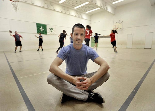 Matthew MacDonald poses for photos while sports are played behind him at Pierre Trudeau School in Toronto, November 5, 2014.J.P. MOCZULSKI/The Globe and Mail