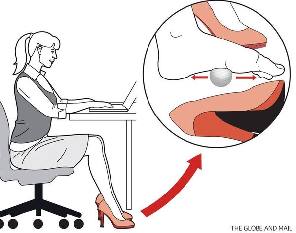 1.While sitting at your desk, place a golf ball under the arch of your foot (any ball will do, but a golf ball is best). 2. Push into the ball so you feel a gentle massage. Take your time and roll it all along the arch of your foot, your heel and even under your toes.CARRIE COCKBURN/The Globe and Mail