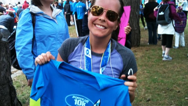 Globe Life's online editor Amberly McAteer after crossing the finish line at the Sporting Life 10K in Toronto, May 1, 2011. She finally got the t-shirt.