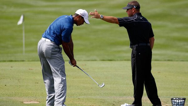 Tiger Woods works with golf instructor Sean Foley on the practice ground prior to the start of the third round of the PGA Championship on the Straits Course at Whistling Straits on Aug. 14, 2010, in Kohler, Wisc.Chris Graythen