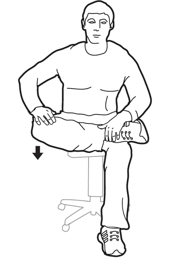 All you need is to be sitting in a chair to do the Figure Four Stretch. Sit tall with your shoulders back. Look straight ahead as you cross your right ankle over your left knee.Carrie Cockburn/The Globe and Mail