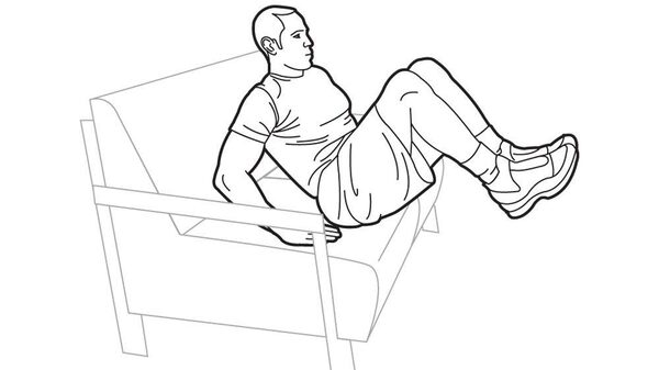 Start with your bum on the edge of the sofa. Place your hands at your sides and about two hand-lengths behind your bum, then lift your legs, knees bent, up to hip height. This is your starting position.Trish McAlaster