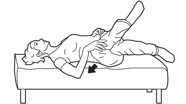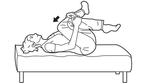 Start by lying on your back with your knees bent and feet on the bed. Cross your right leg over the left so your thighs are touching. Pull both knees into your chest and hold for 30 seconds. Switch legs and repeat.Carrie Cockburn/The Globe and Mail