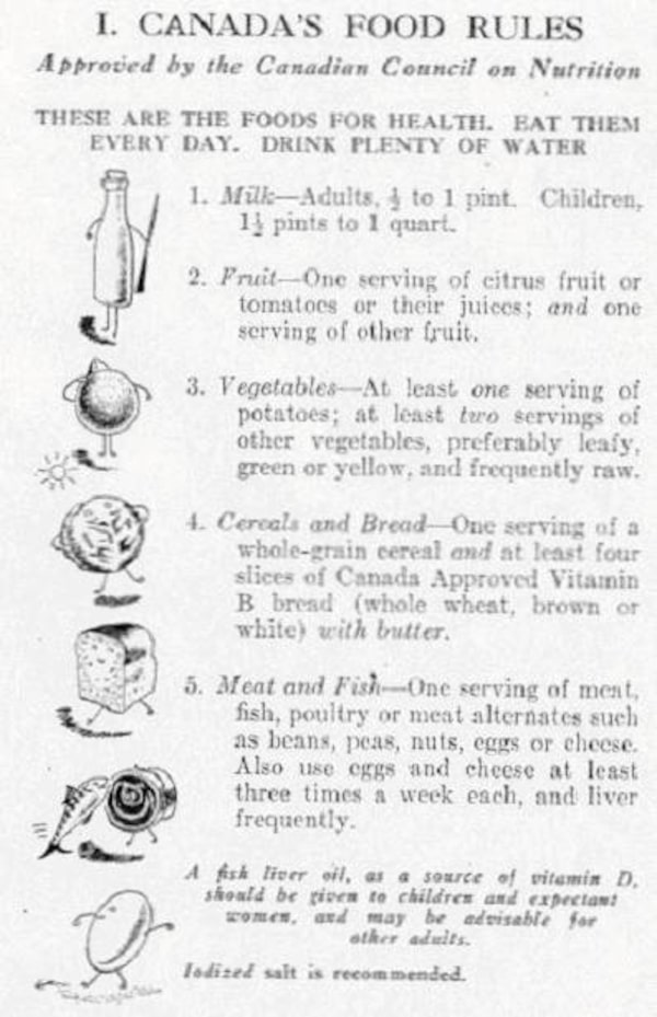 Canada's first food guide, the Official Food Rules, was introduced to the public in July 1942. This guide acknowledged wartime food rationing, while endeavoring to prevent nutritional deficiencies and to improve the health of Canadians.