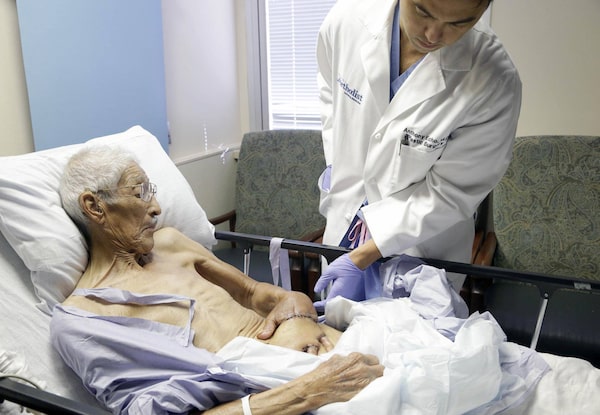 Surgeon Anthony Echo, right, examines Frank Reyes’s hand. Reyes hopes to recover full use of his hand after almost losing it.Pat Sullivan/The Associated Press