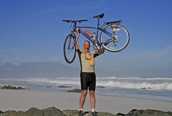 Bill Nelems, 71, arrives victorious in Cape Town, South Africa, in 2010 after completing a 4,500-kilometre leg of the Tour d’Afrique bicycle trek. He did the ride to raise funds and awareness for the an initiative which sends Canadian doctors and nurses to Africa to mentor Zambian peers.Courtesy of Nelems family