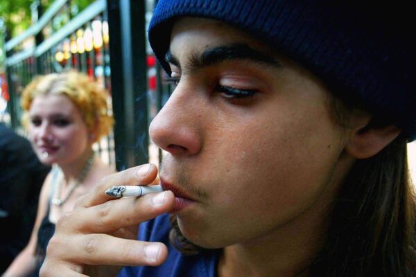 18-year-old Mark Begin smokes a cigarette while his friend April Donovan, left, looks on in downtown Ottawa on Monday June 14, 2004. A new survey says 17.8 per cent of Canadians smoke, compared to 24.3 per cent who smoked 10 years ago. It's the second time in as many days that a federal study suggests a drop in youth smoking.Tobin Grimshaw/The Canadian Press