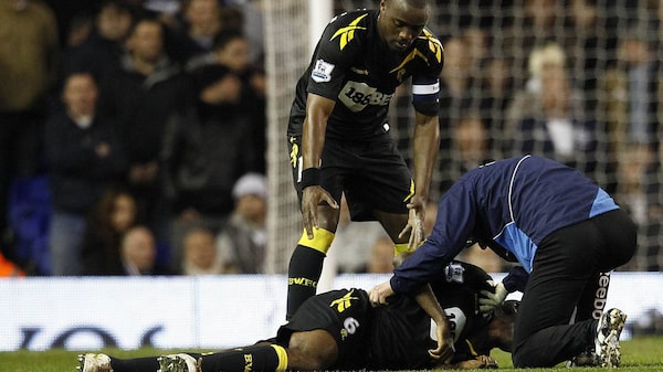 Bolton Wanderers' Nigel Reo-Coker helps a member of the club's medical staff attend to Fabrice Muamba after he collapsed on the pitch during their FA Cup quarter-final soccer match against Tottenham Hotspur at White Hart Lane in London March 17, 2012.Suzanne Plunkett / Reuters