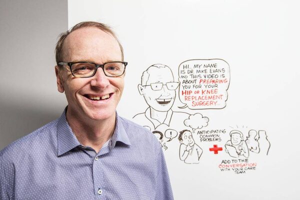 In a Toronto film studio, illustrator Liisa Sorsa is carefully drawing the femur and the tibia on a three-metre-long white board. "That okay with you?" she asks Mike Evans, the family doctor who is standing at her elbow, overseeing the creation of a public-health video about what patients should expect from joint-replacement surgery. She has already rendered his bespectacled face and gap-toothed smile on the white board. In fact, she and director/producer Nick de Pencier have turned her version of Evans's cheerful face into something of an Internet sensation.