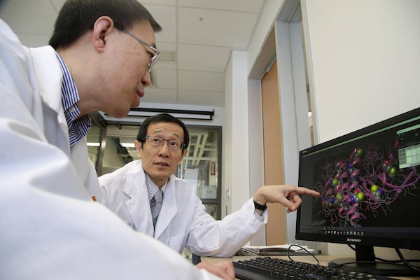 Dr. Rui Wang and colleague Dr. Guangdong Yang look at a 3D model of an MMP2 protein in a lab at Laurentian University in Sudbury, Ontario.